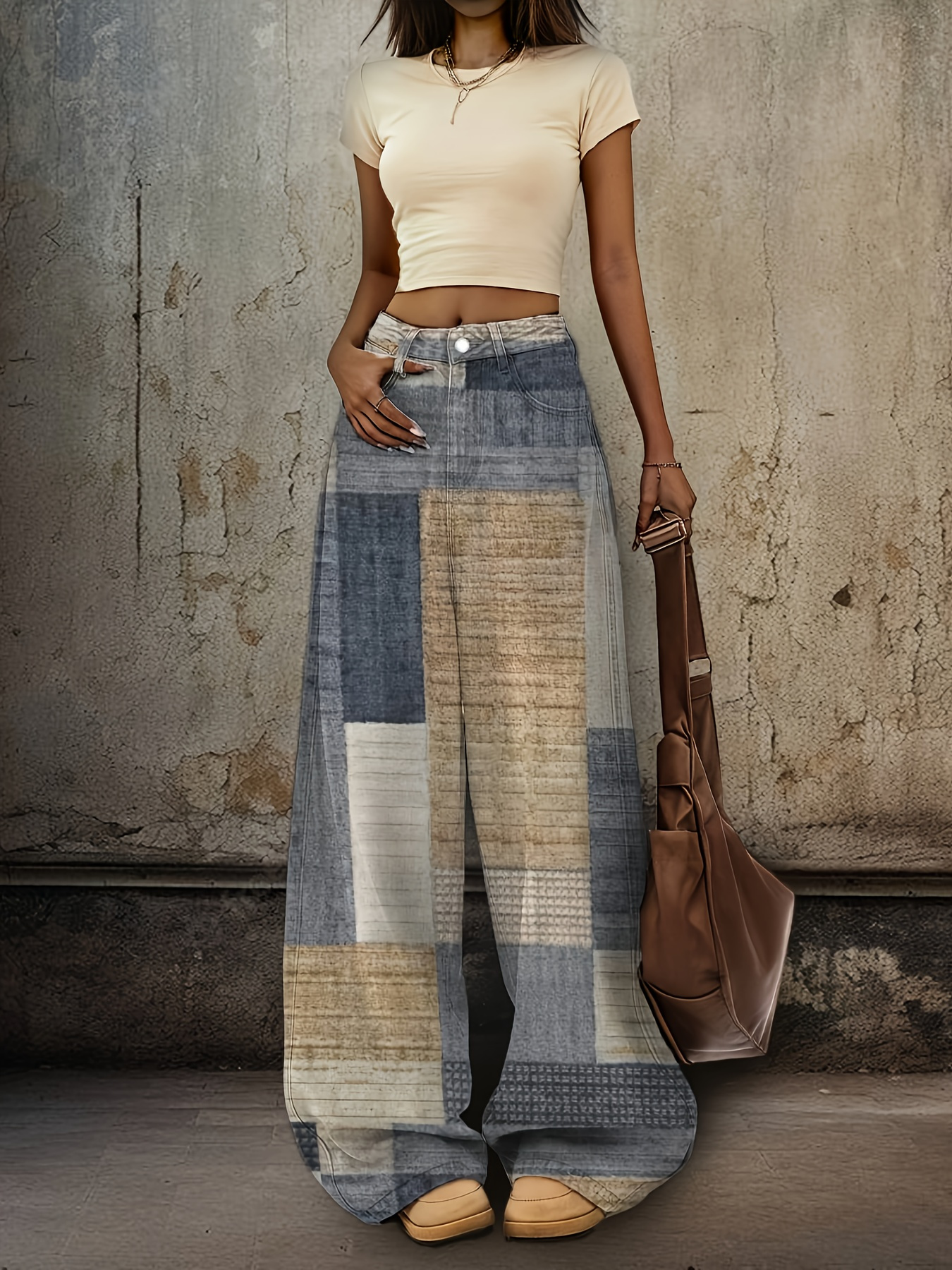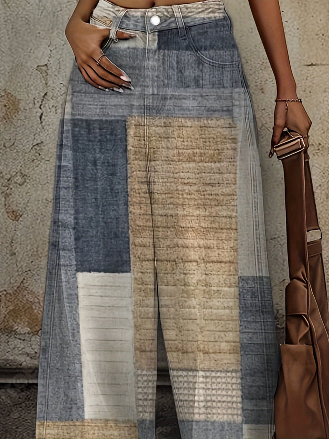 1 Pair Women's High-Waisted Loose Flared Jeans - Retro Casual Denim Pants with Creative Patchwork Print, Polyester Fabric, All-Season Comfort, Machine Washable, Ladies Jeans, Comfortable Fashion, Bellbottom Silhouette, Textur