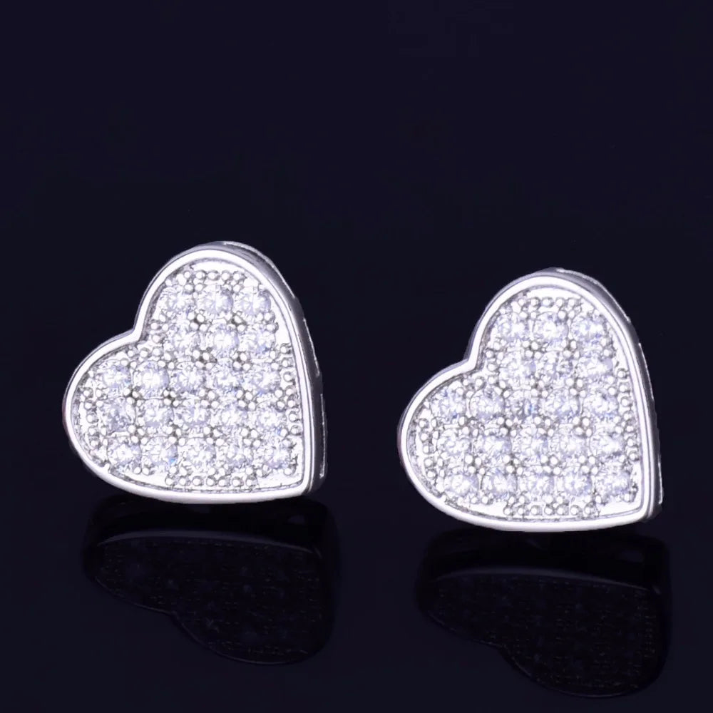 14MM Width Heart-shaped Gold Color Stud Earring For Men Women Full Cubic Zircon Screw Back Earrings Fashion Hip Hop Jewelry Gift