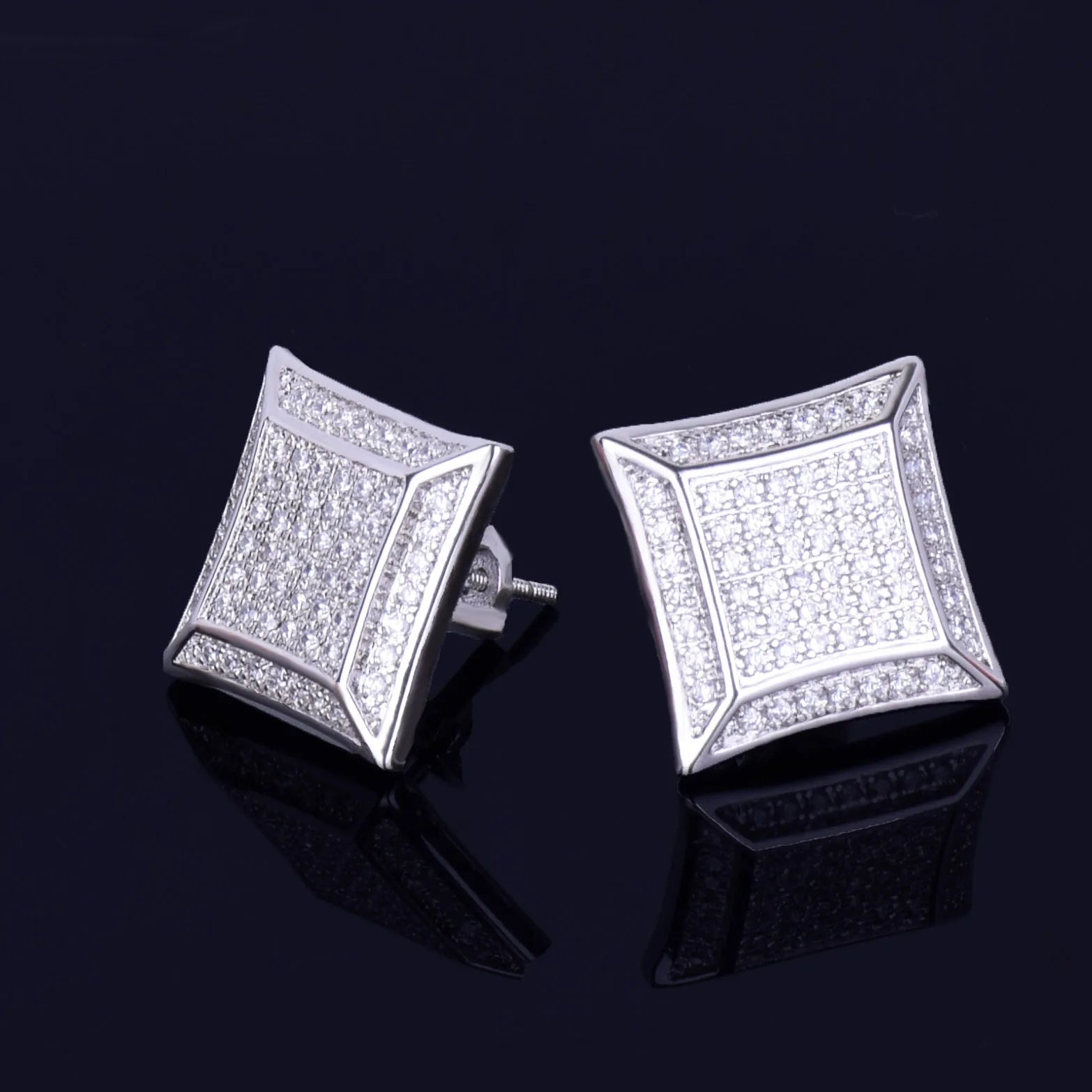 15MM Big Square Men Stud Earring Gold Color Full Cubic Zircon Screw Back Earrings Hip Hop Jewelry for Women