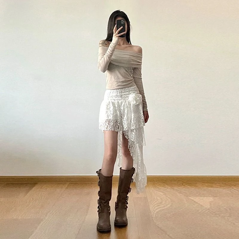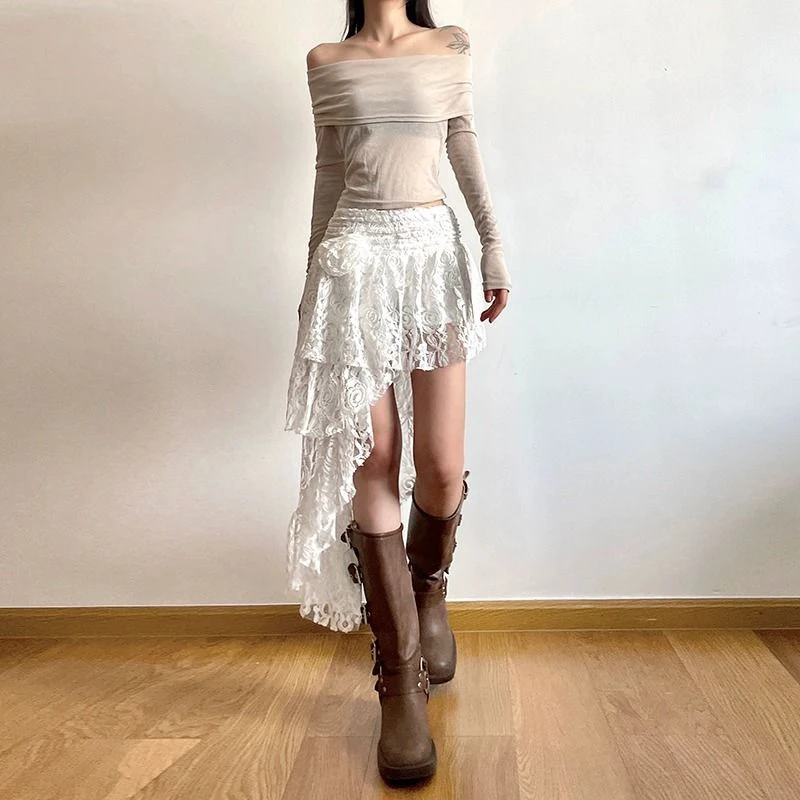 Asymmetrical Lace Skirt Women Sexy Bohemian Elegant High Waist A Line Skirt 2000S Retro Streetwear Y2K Casual White Skirts New
