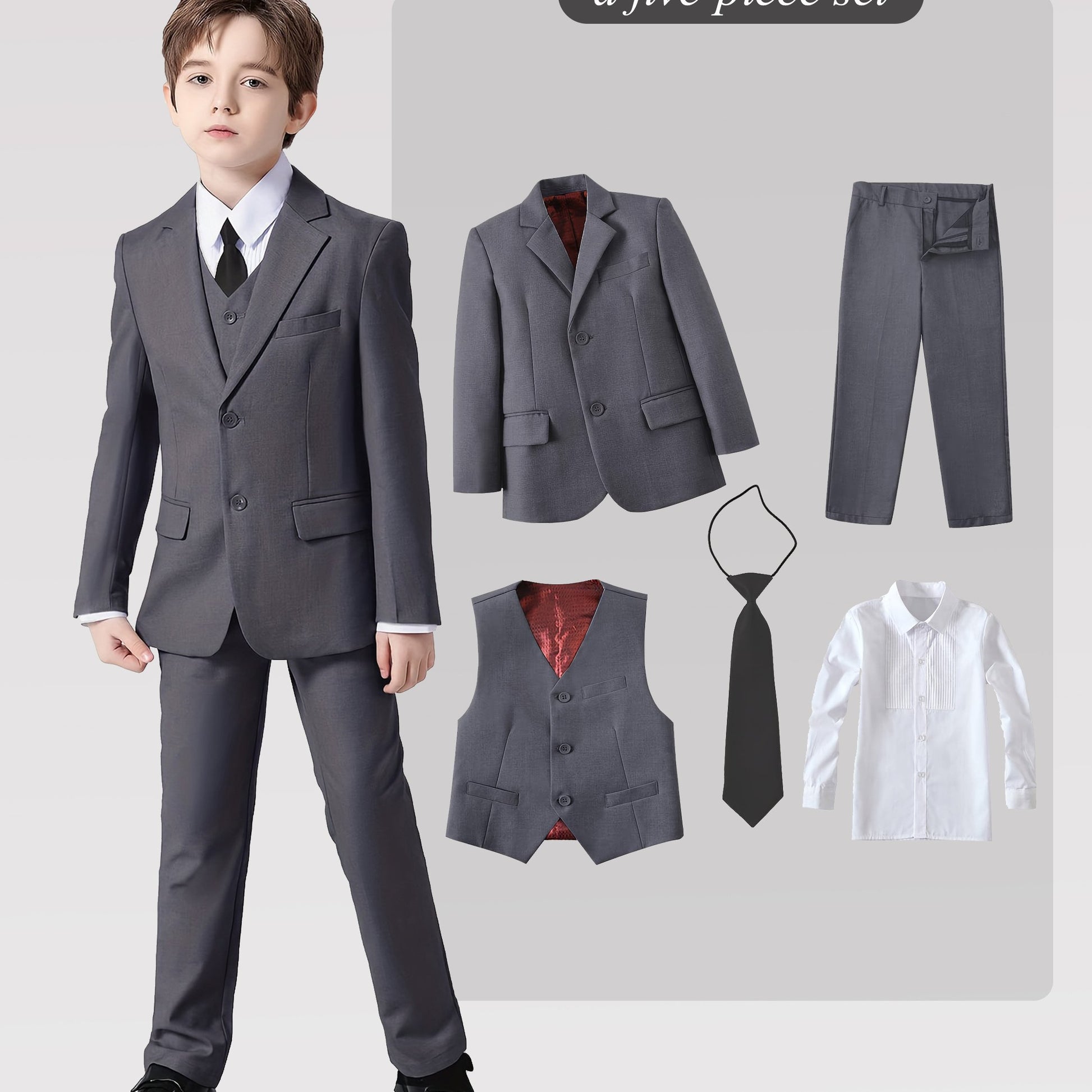 Back to School Season Boy's Formal Suit Set Slim Fit Blazer & Shirt & Pants & Vest & Tie 5pcs Set for Wedding Ring Bearer Birthday Party Speech Prom Dress Youngsters Tuexdo Outfits Black Wine Red Dark Gray, Ring Bearer Attire