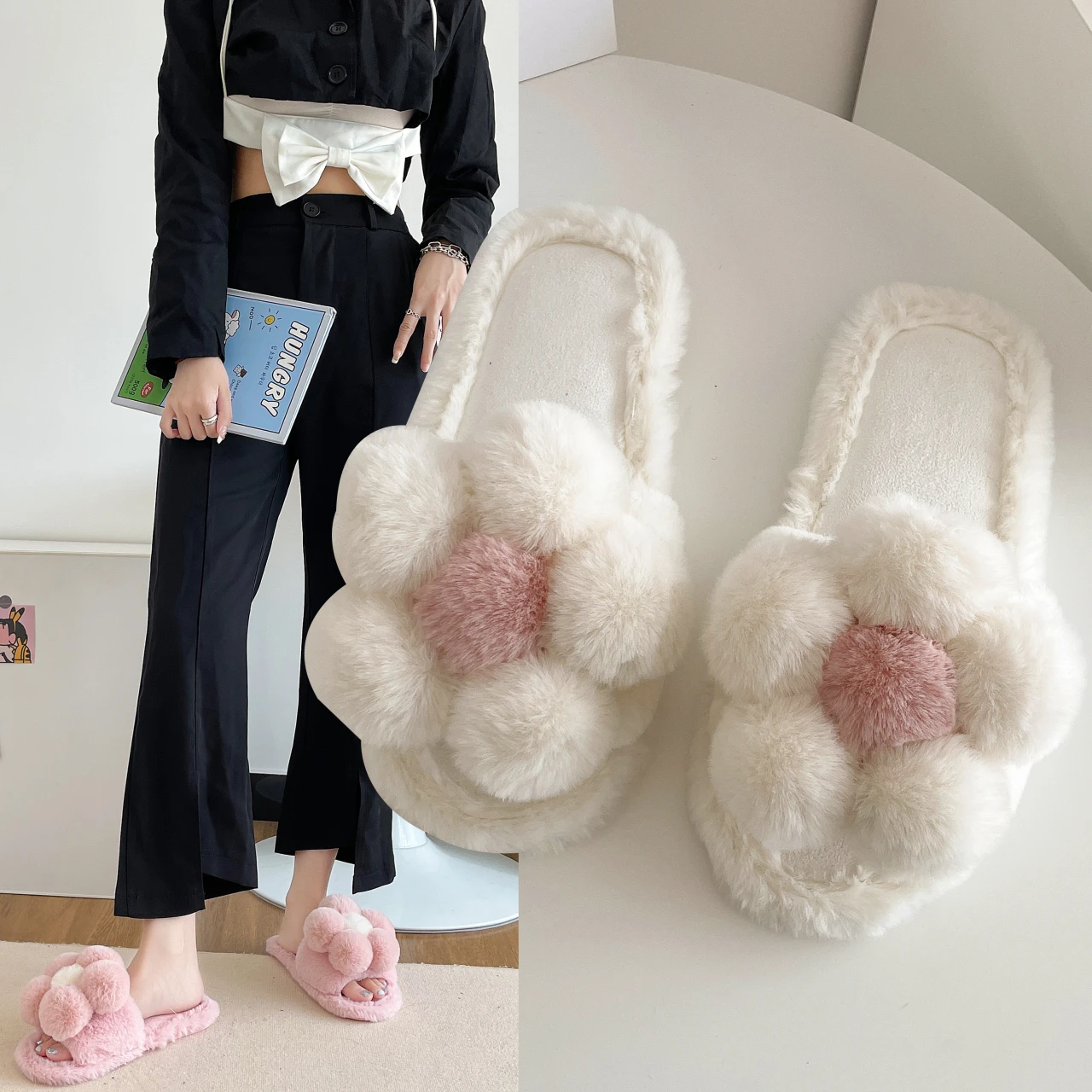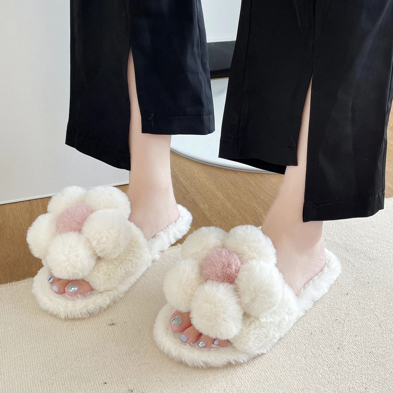 Cute cartoon flower one-word cotton slippers women's 2025 winter new thick-bottomed non-slip outer wear plush slippers