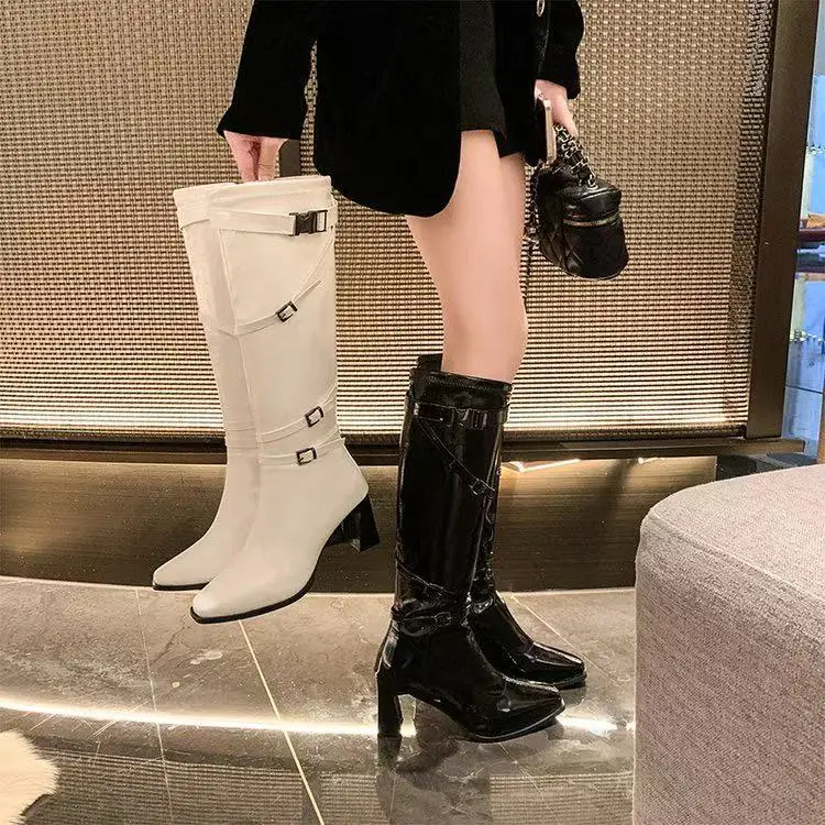 Foreign style high-heeled boots women's 2025 autumn new belt buckle thick heel square head high boots temperament knight boots