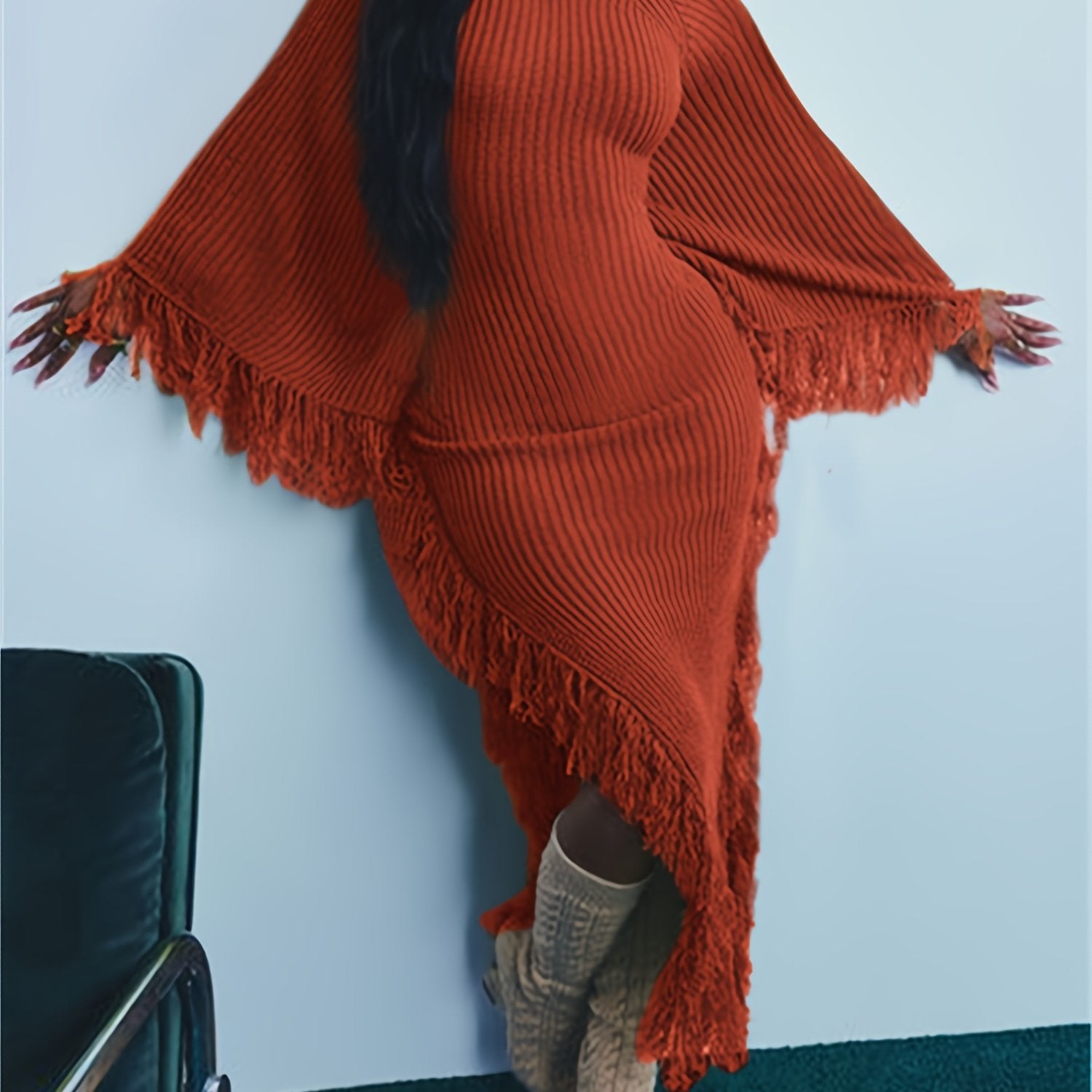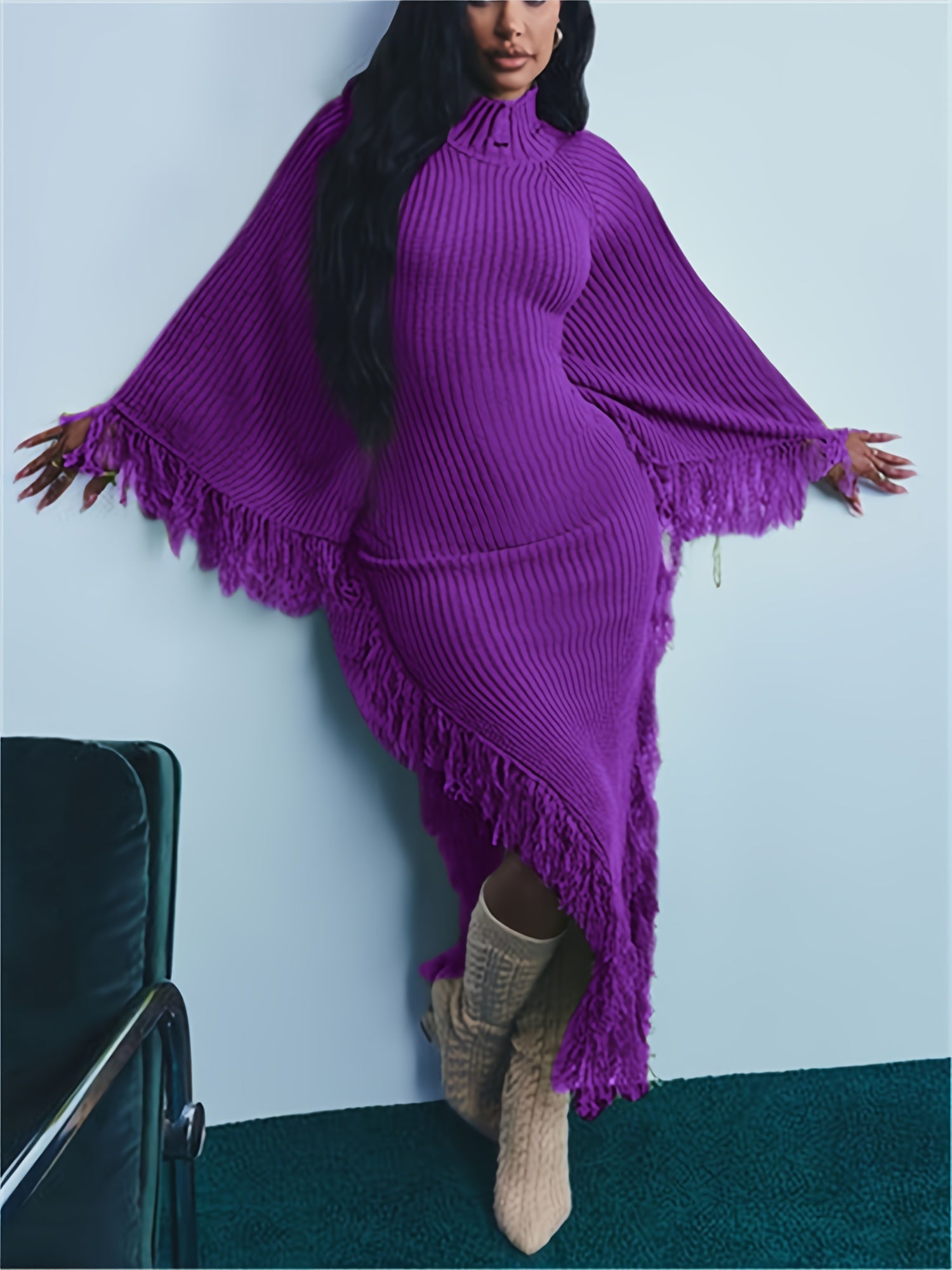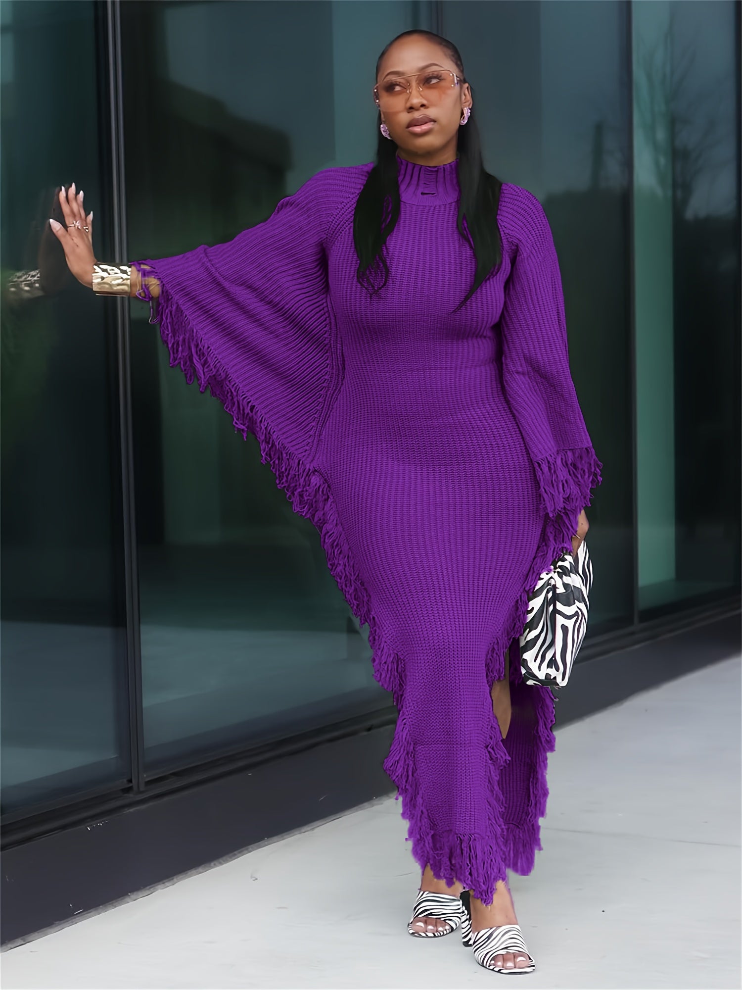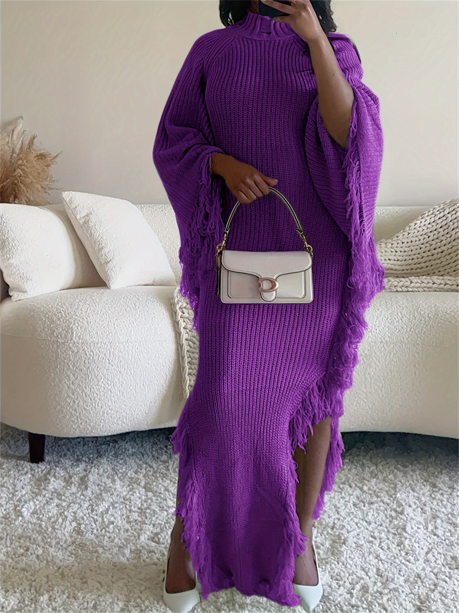 Fringe Trim Sweater Dress For Women, Batwing Long Sleeve High Neck Maxi Dress With Asymmetrical Hem, Sexy And Chic Style, For Fall Winter
