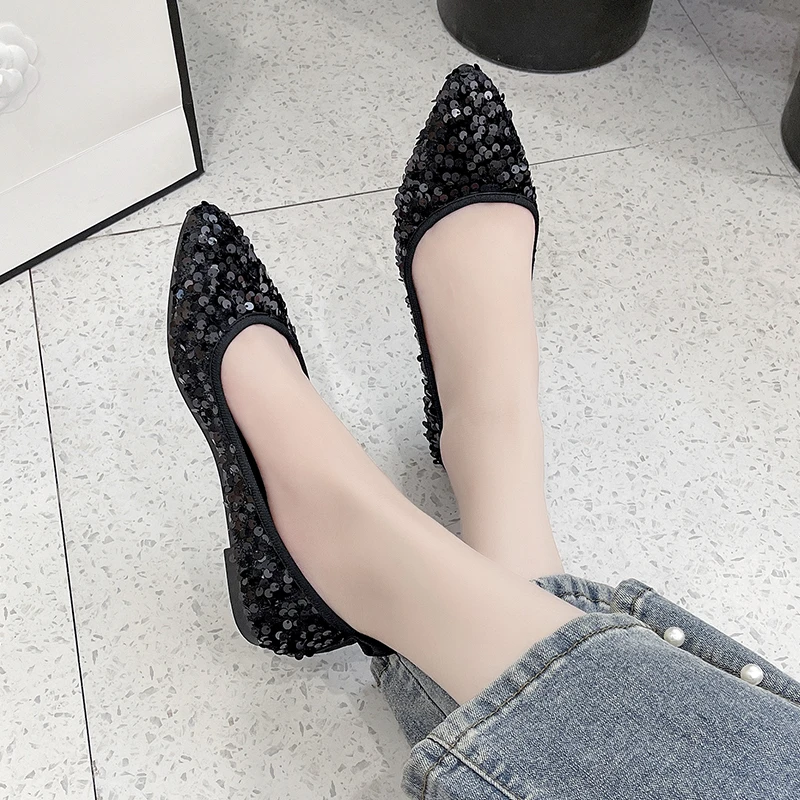New pointed head shallow mouth one pedal sequined women's single shoes casual Korean version ladyshoes commuter style
