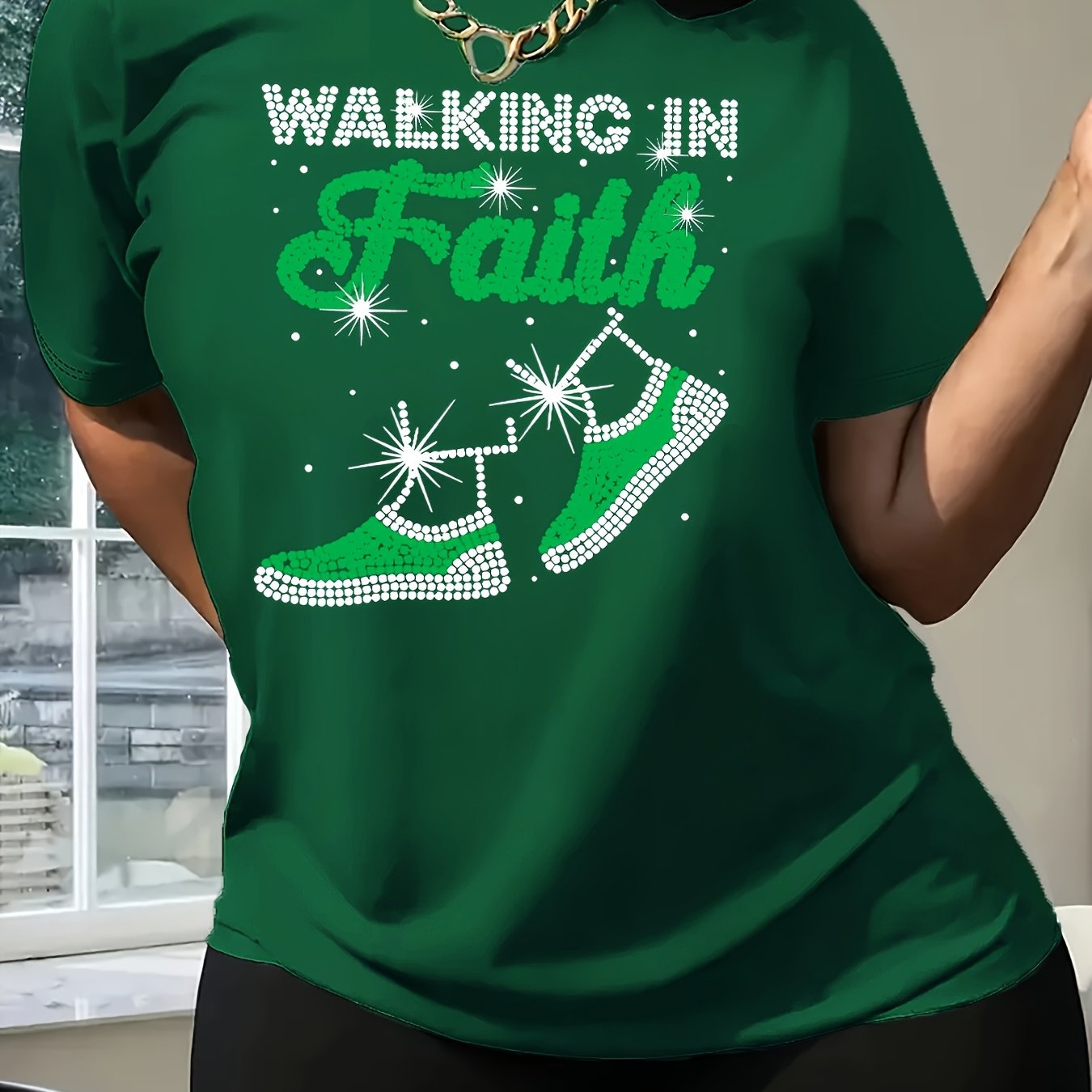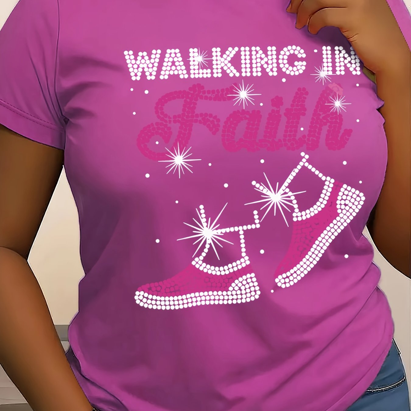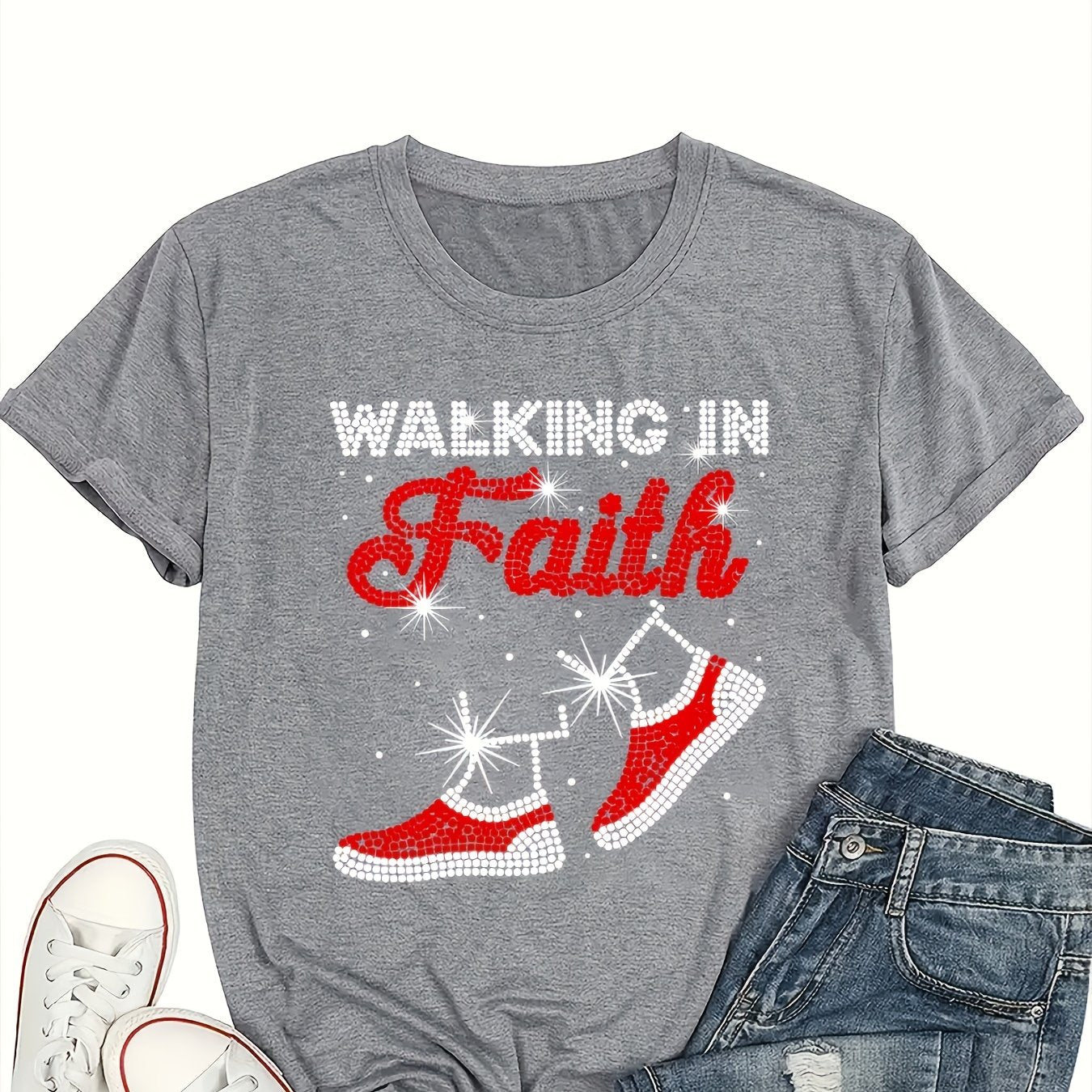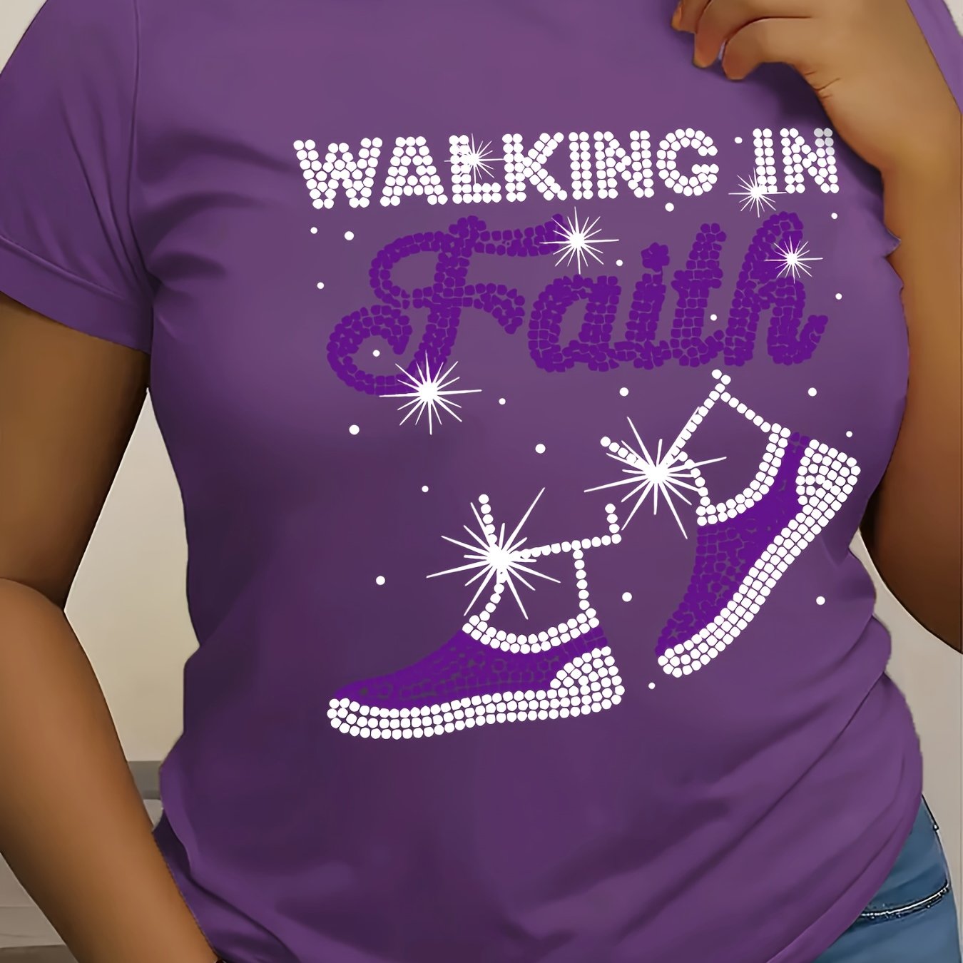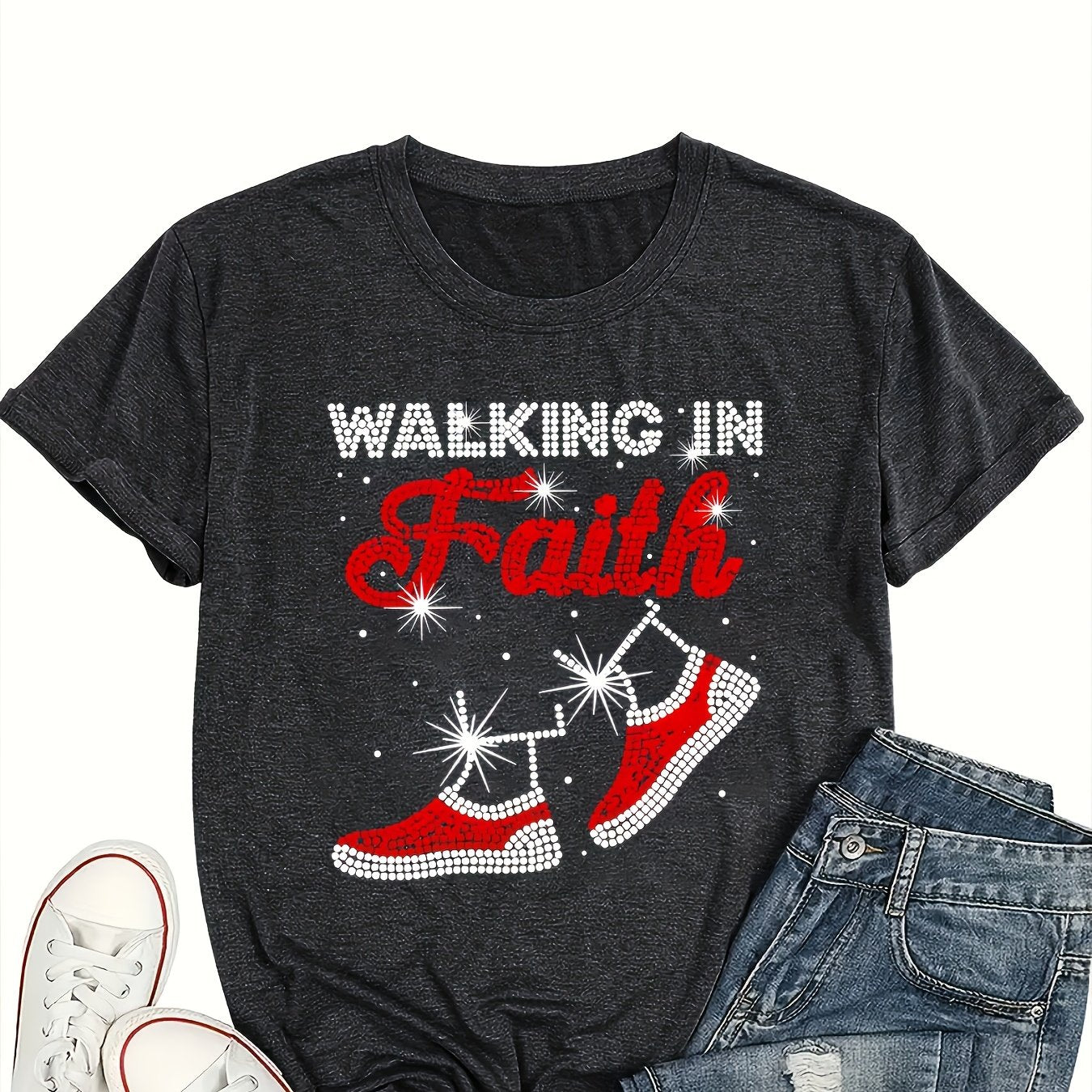 [Sparkling Inspirational Letter Print Tee] Dazzle Casual, Sparkling Rhinestone Letter Print T-Shirt for Women - Casual Crew Neck, Short Sleeve, Inspirational Faith Graphic Tee