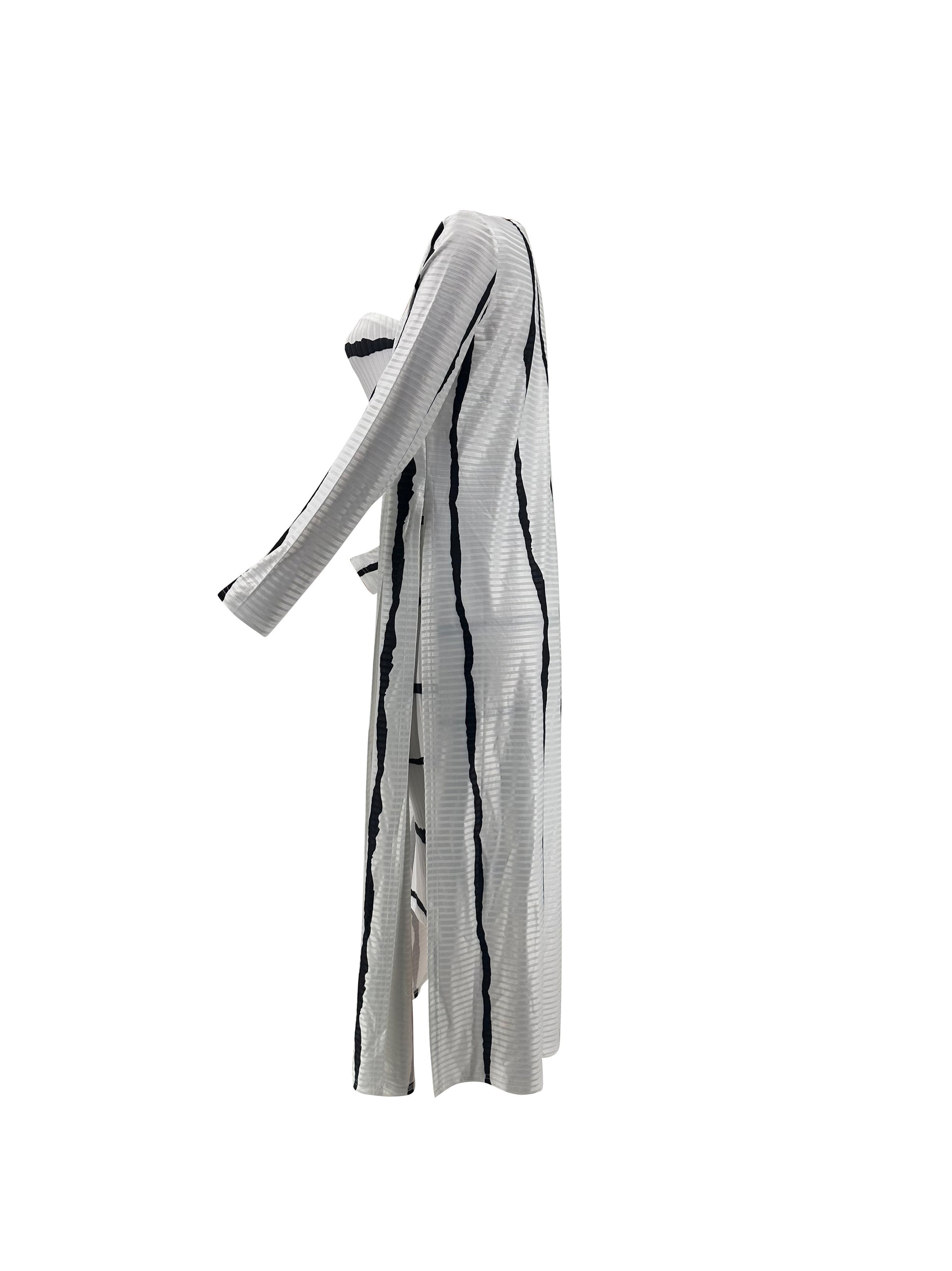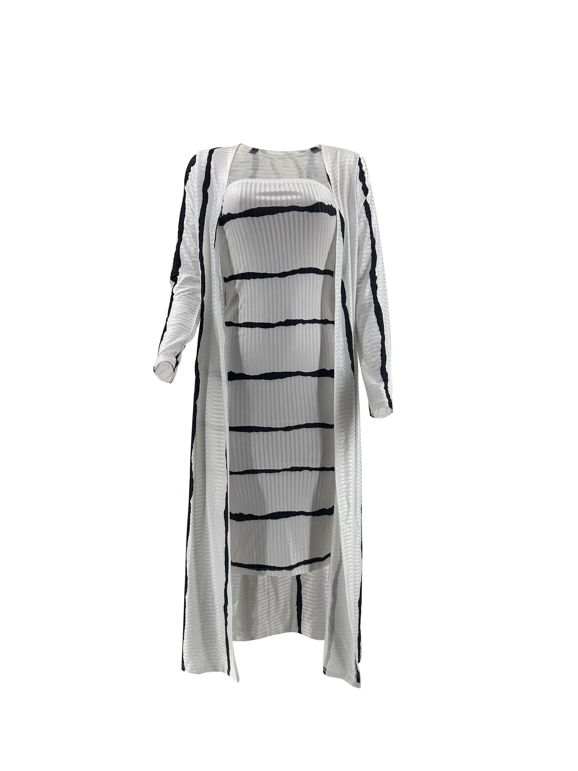 Striped Matching Two-piece Set, Casual Long Sleeve Open Front Split Cardigan & Slim Ribbed Midi Tube Dress Outfits, Women's Clothing