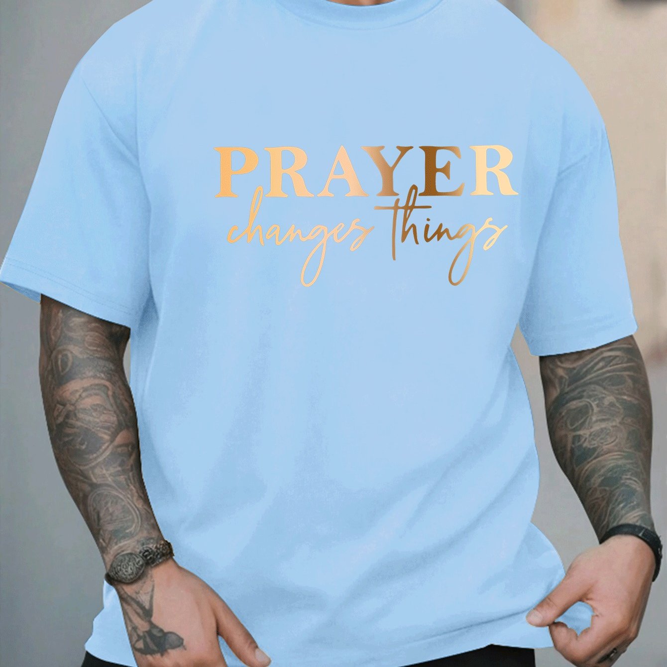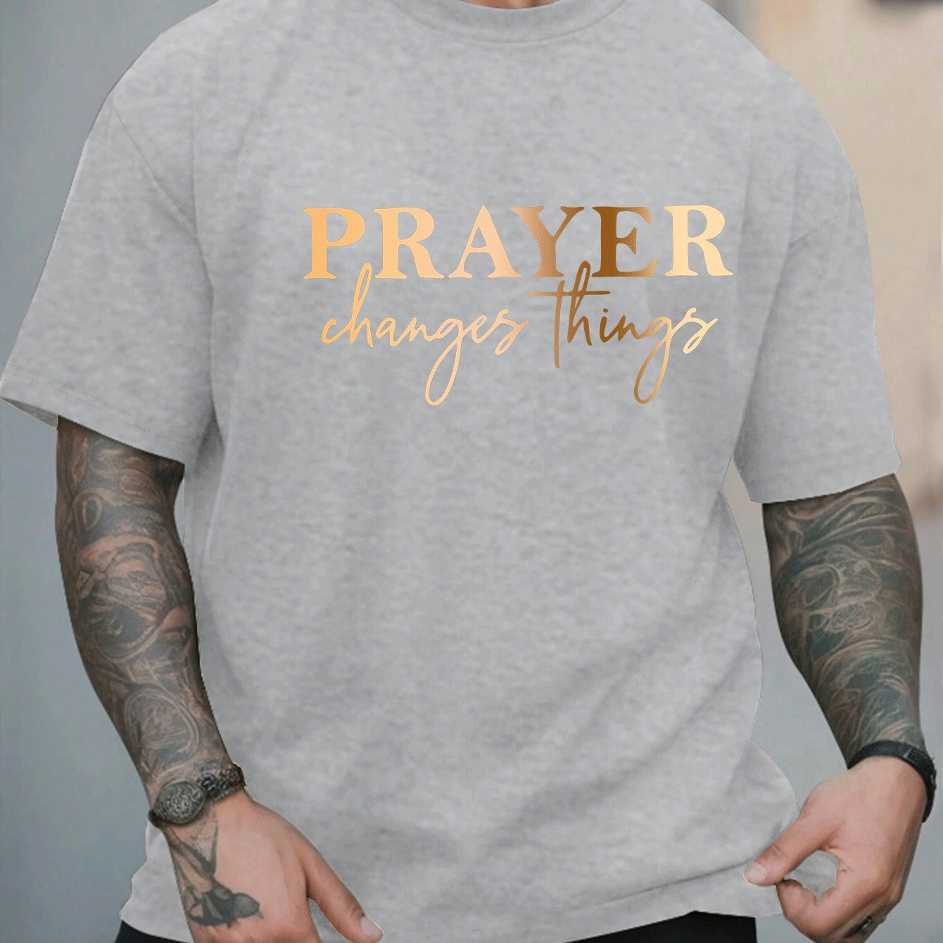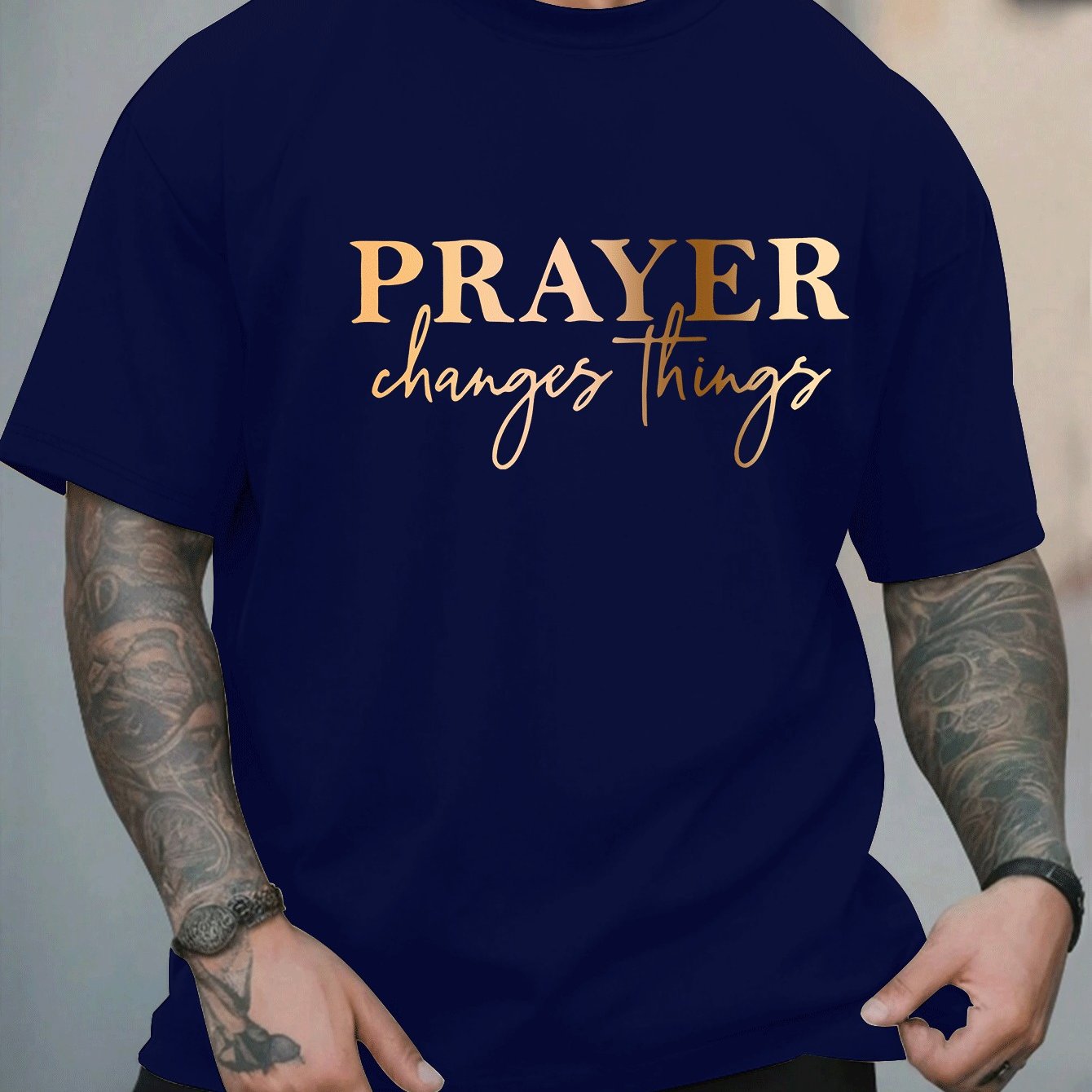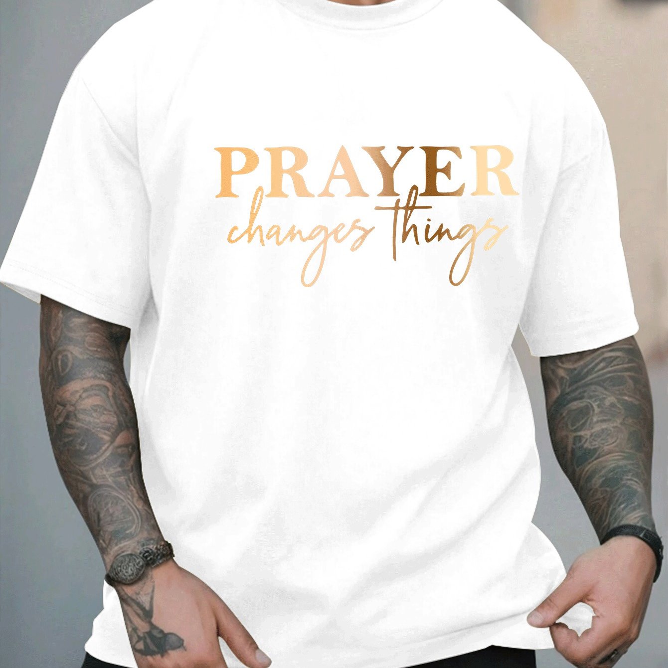 [Summer Fashion, Prayer Quote T-Shirt] Plus Size Men's Casual T-Shirt - "Prayer Changes Things" Quote, Geometric Pattern, Round Neck, Short Sleeve, Summer Fashion - Polyester Knit Fabric Top
