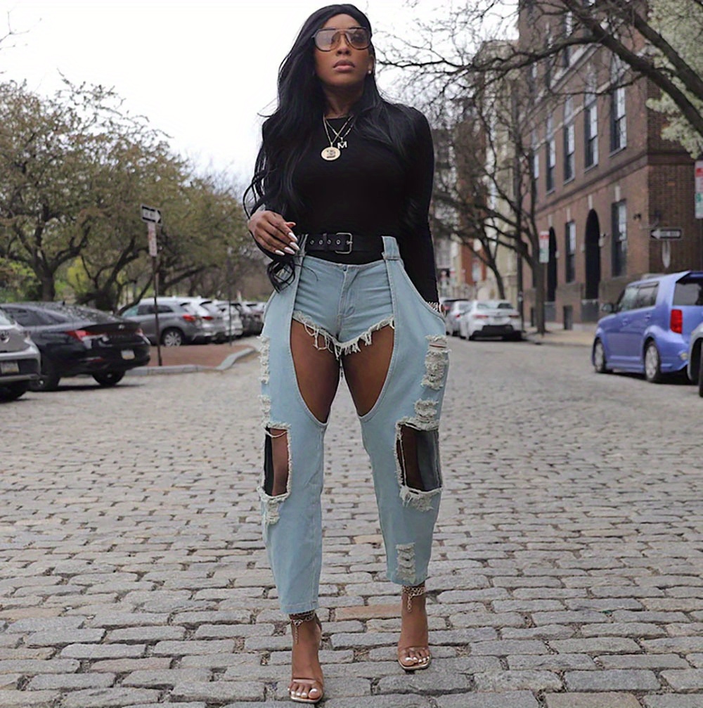 [Vintage Y2K Streetwear Jeans] Vintage Distressed Women's Y2K Streetwear Jeans | Non-See-Through Ripped Denim Pants with Button Closure, Loose Fit for Everyday & Formal Outfits - Fall/Winter Casual Pants, Fall Fashion, Street