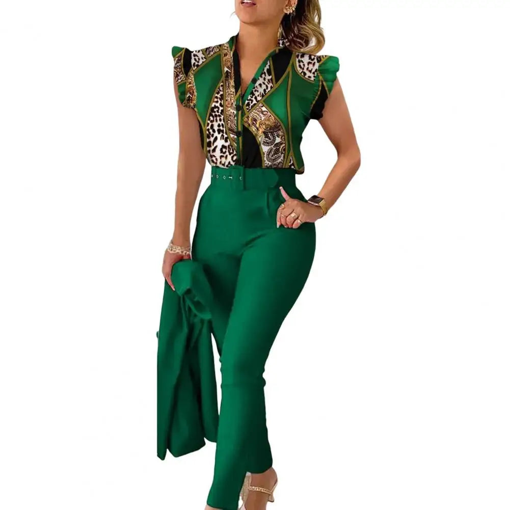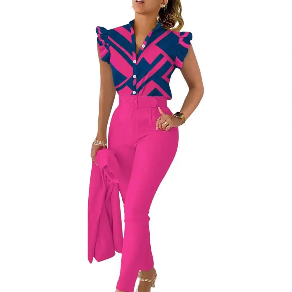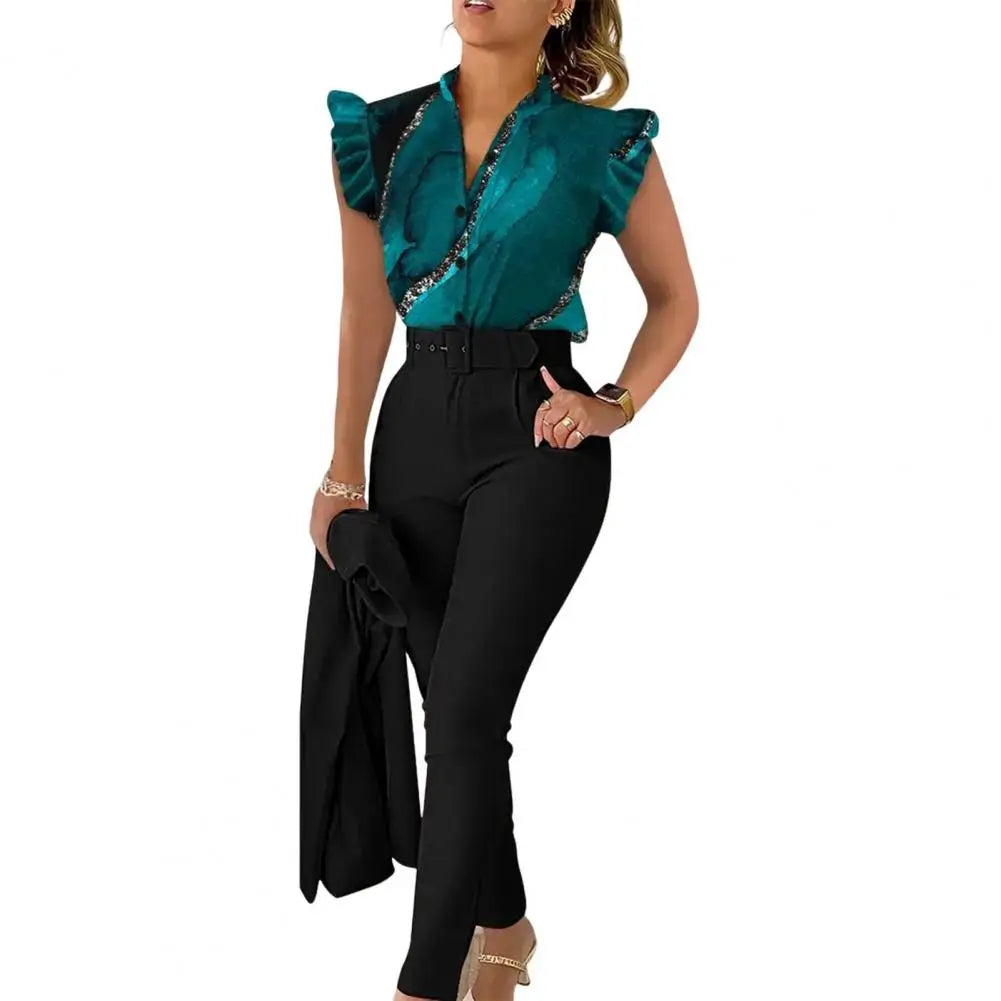 Women Shirt Trousers Set Elegant Women's Office Wear Set with V Neck Top High Waist Pants Belt Chic Color Matching Slim for Work