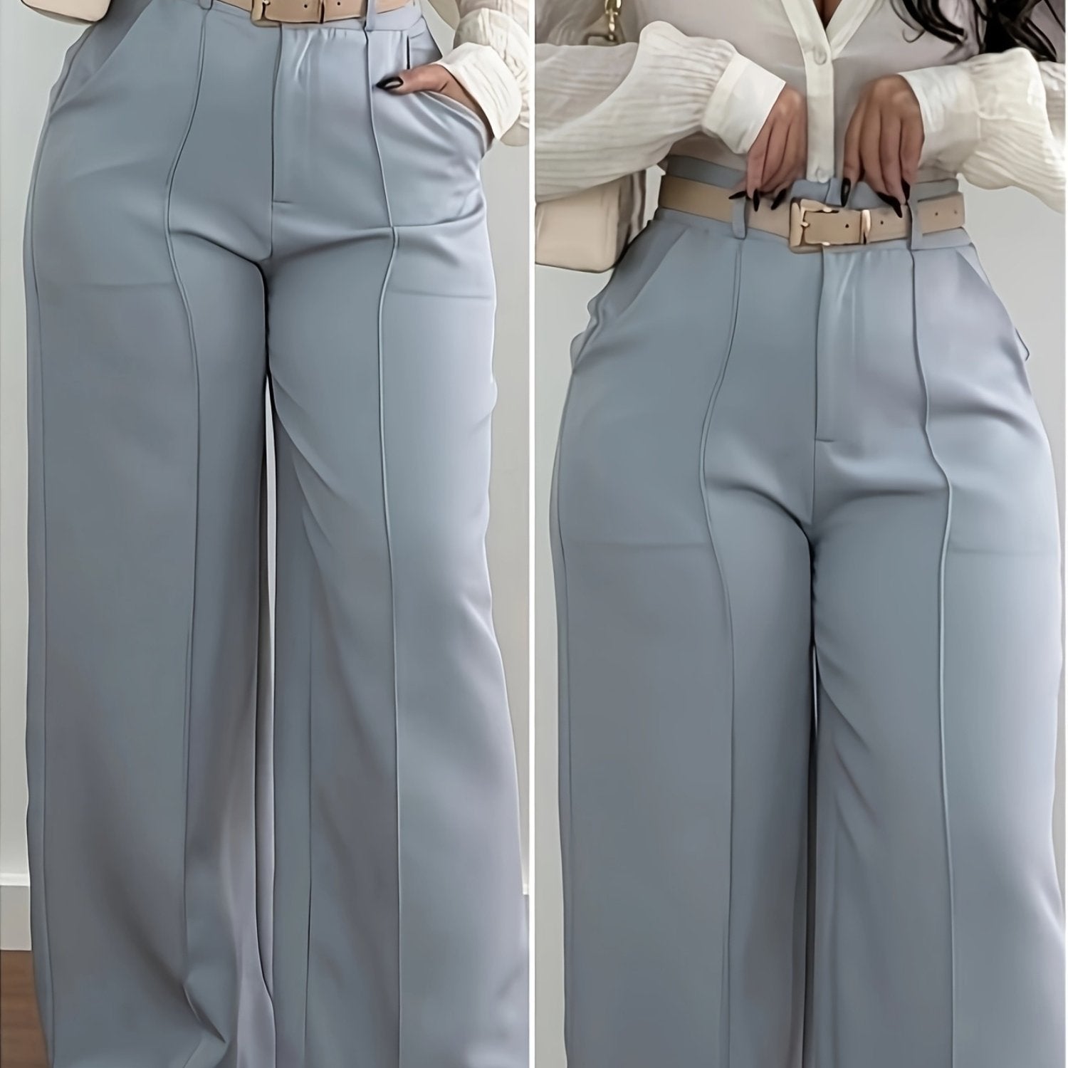 Women'S Elegant Light Blue Straight Leg Pants - All-Season, Solid Color, Pocketed, No Belt Needed, Stylish Workwear, Professional Attire|Straight Leg Pants|Pocketed Pants