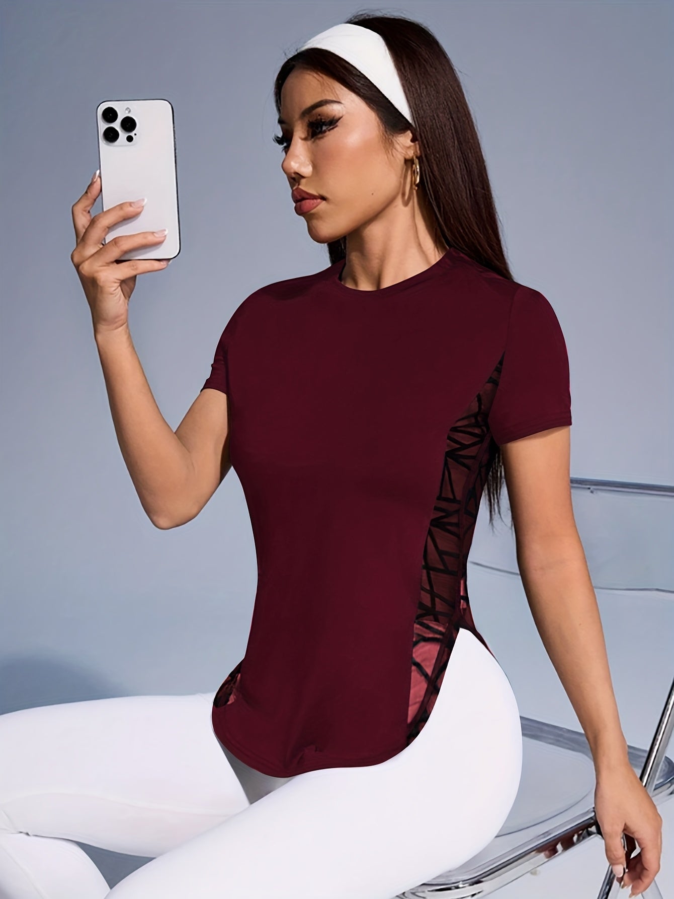 Women'S Slim Fit Short Sleeve T-Shirt with Side Mesh Panel Detail - Breathable Round Neck Top for, Casual & Party Wear, Spring/Summer Elegant Solid Color Tee, Machine Washable, Clothes, Apparel, Stylish Contrast Detailing, Co