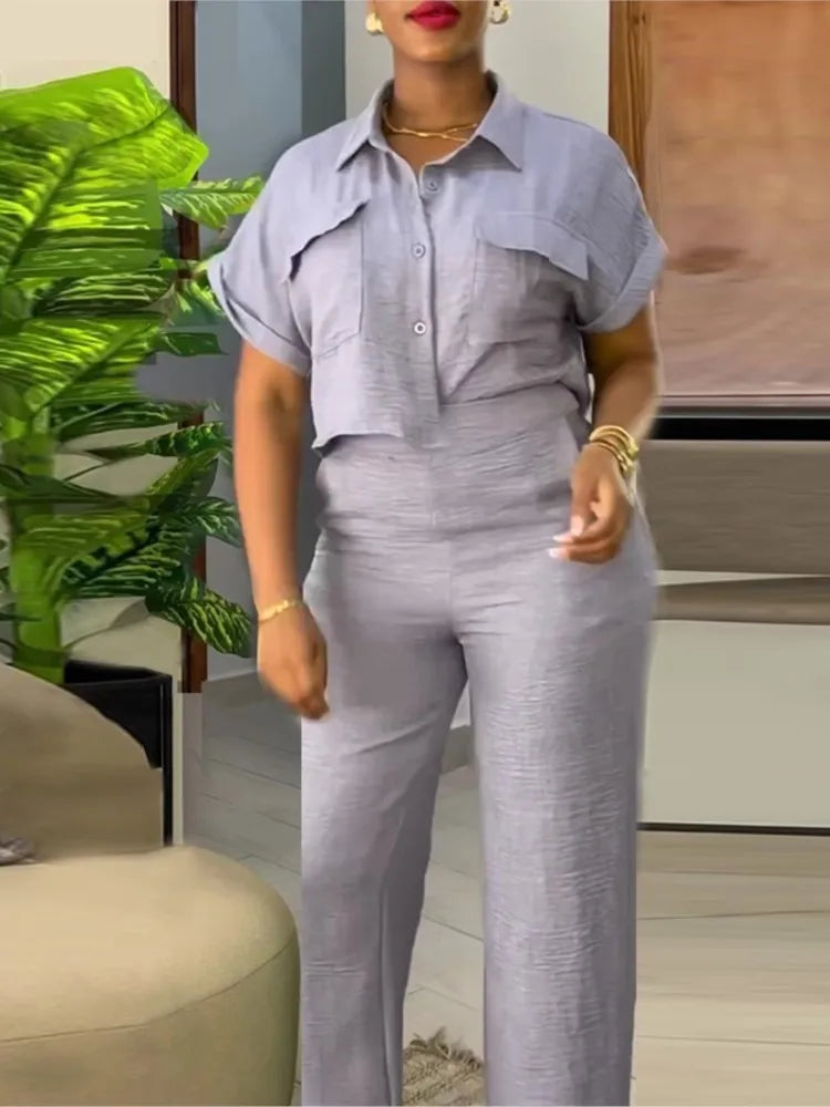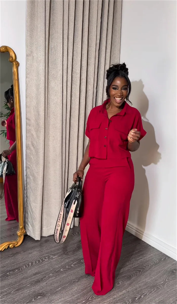Women's Two-piece Set Spring Summer New Style Lapel Short-sleeved Shirt High Waist Wide Leg Trousers Casual Suit Women Clothing